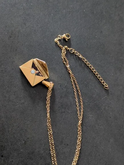 This elegant envelope locket is designed to hold what matters most. With its clean lines and refined finish, it opens to reveal a hidden space for a photo or small keepsake, turning a simple necklace into a deeply personal piece. Crafted for everyday wear, it balances timeless design with thoughtful functionality, making it perfect for keeping a loved one, a memory, or a moment close to your heart.